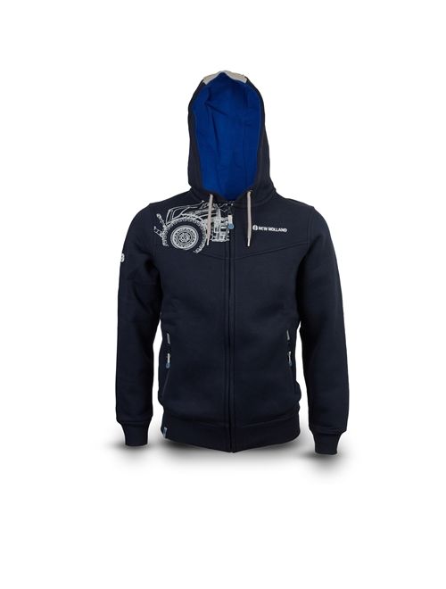 Marineblaues Sweatshirt mit Kapuze; 2 Seitentaschen mit Reißverschluss, Kapuze mit grauem Einsatz und royalblauem Futter, graue Kapuzenkordel, personalisiertes Nackenband. Gesticktes New Holland Logo an der linken Brust, Blatt am rechten Ärmel und an der Kapuze, charakteristisches Etikett an der Vorderseite unten rechts, personalisierter Zipper.